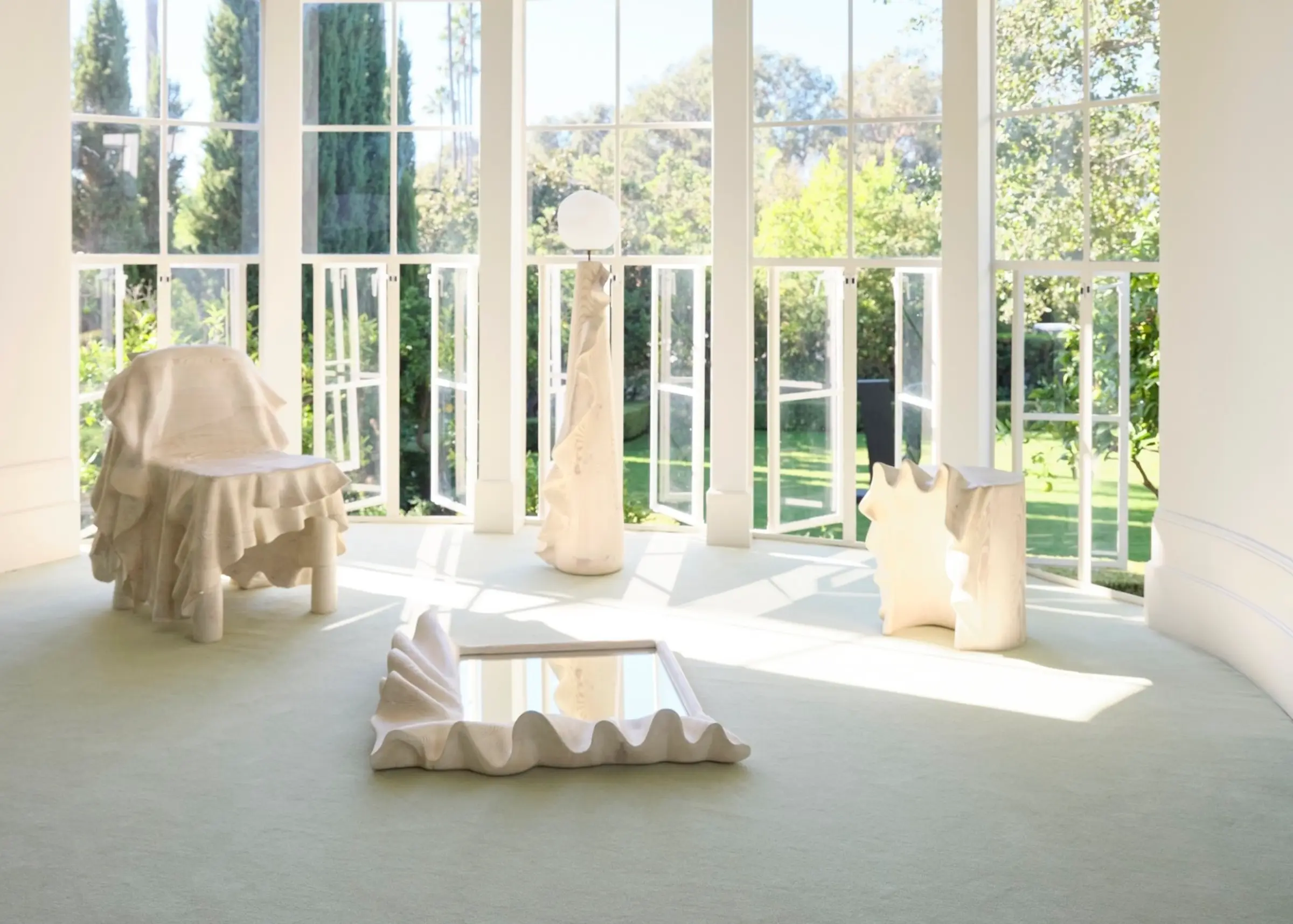 LA woodworker Sam Klemick has modelled a side table, chair, floor lamp and mirror after a vintage Emanuel Ungaro gown in Wearstler’s closet. The collection, called Hollywood, is made from reclaimed Douglas fir