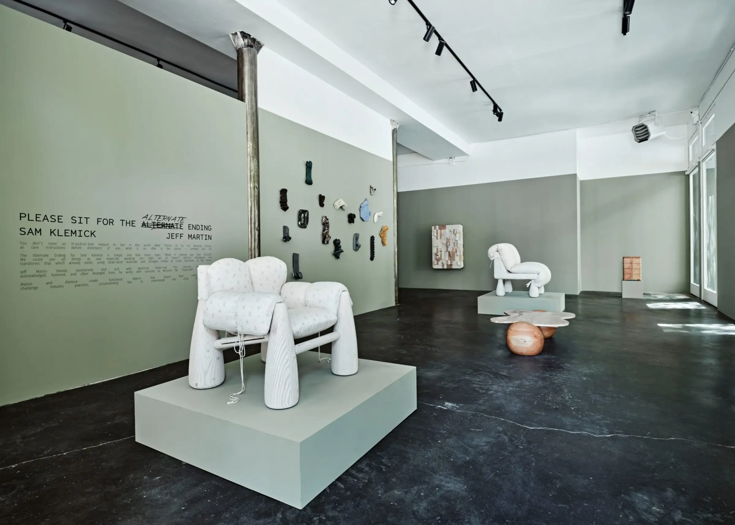 The plump furniture of LA-based Sam Klemick sits alongside the tiled-covered joinery of Vancouver-based Jeff Martin in an exhibition at Objective Gallery in New York.