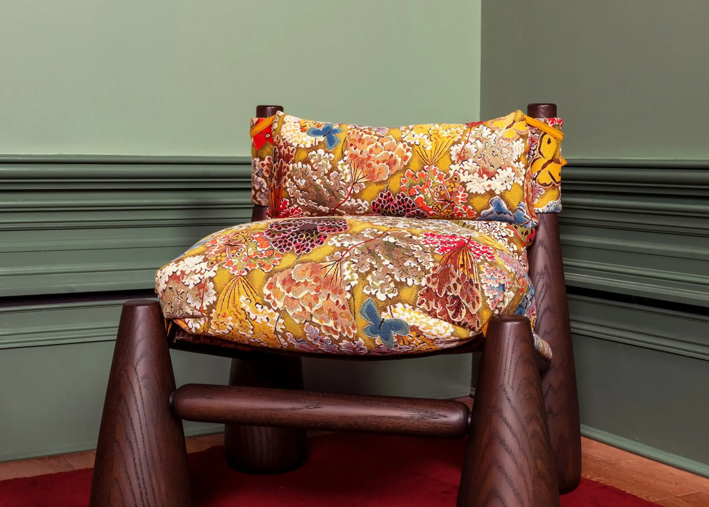 Los Angeles designer Sam Klemick upholstered her Bell Chair in a Pierre Frey mustard yellow brocade with bright florals and butterflies for the Petra Hardware x Sight Unseen Collection exhibition, which took place at the Host on Howard showroom in SoHo.