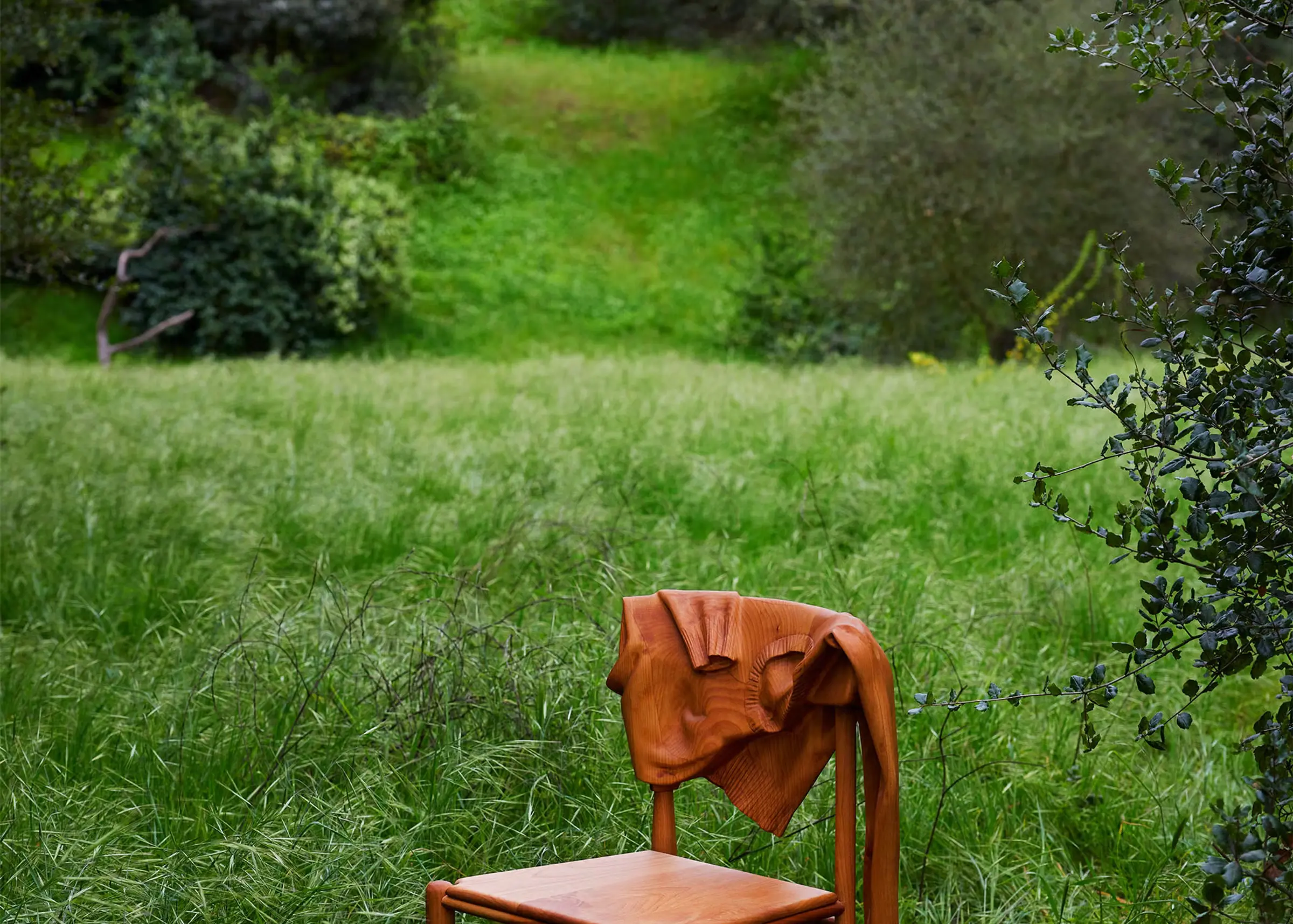 No, your eyes are not deceiving you: This surreal chair has a carved wood sweater casually draped over its back.