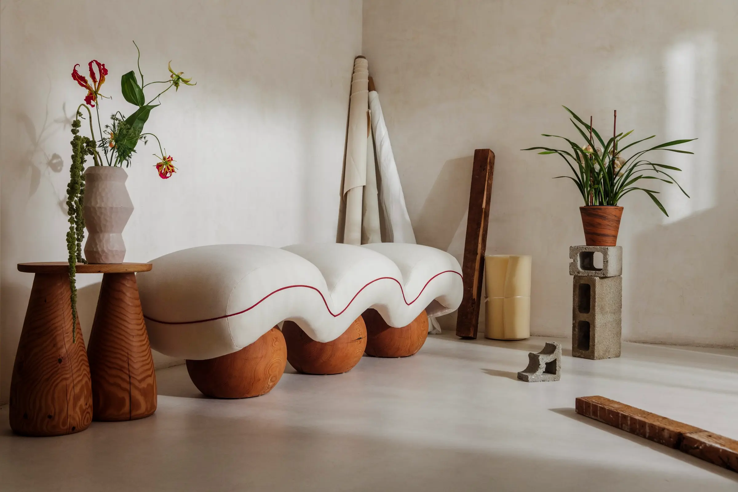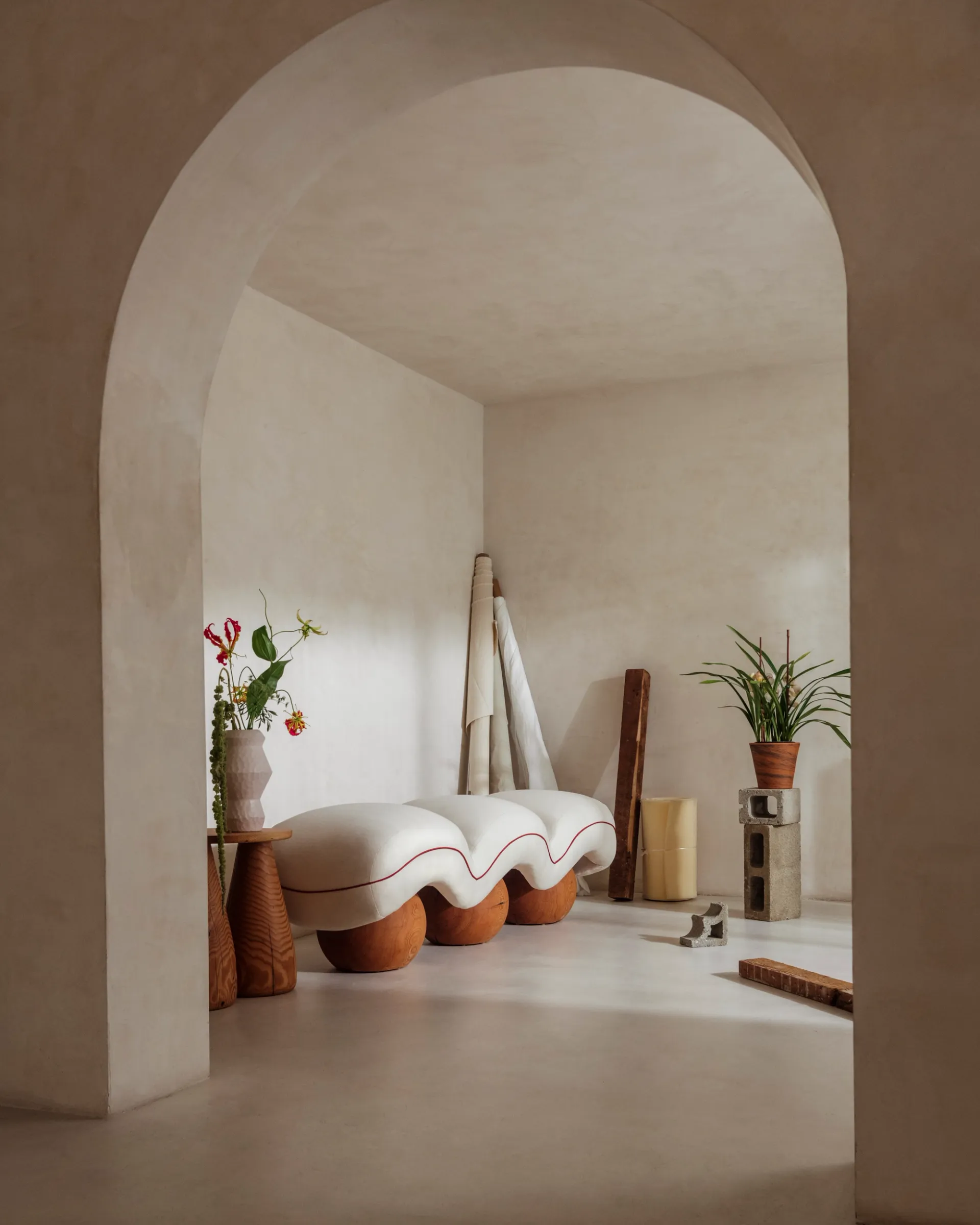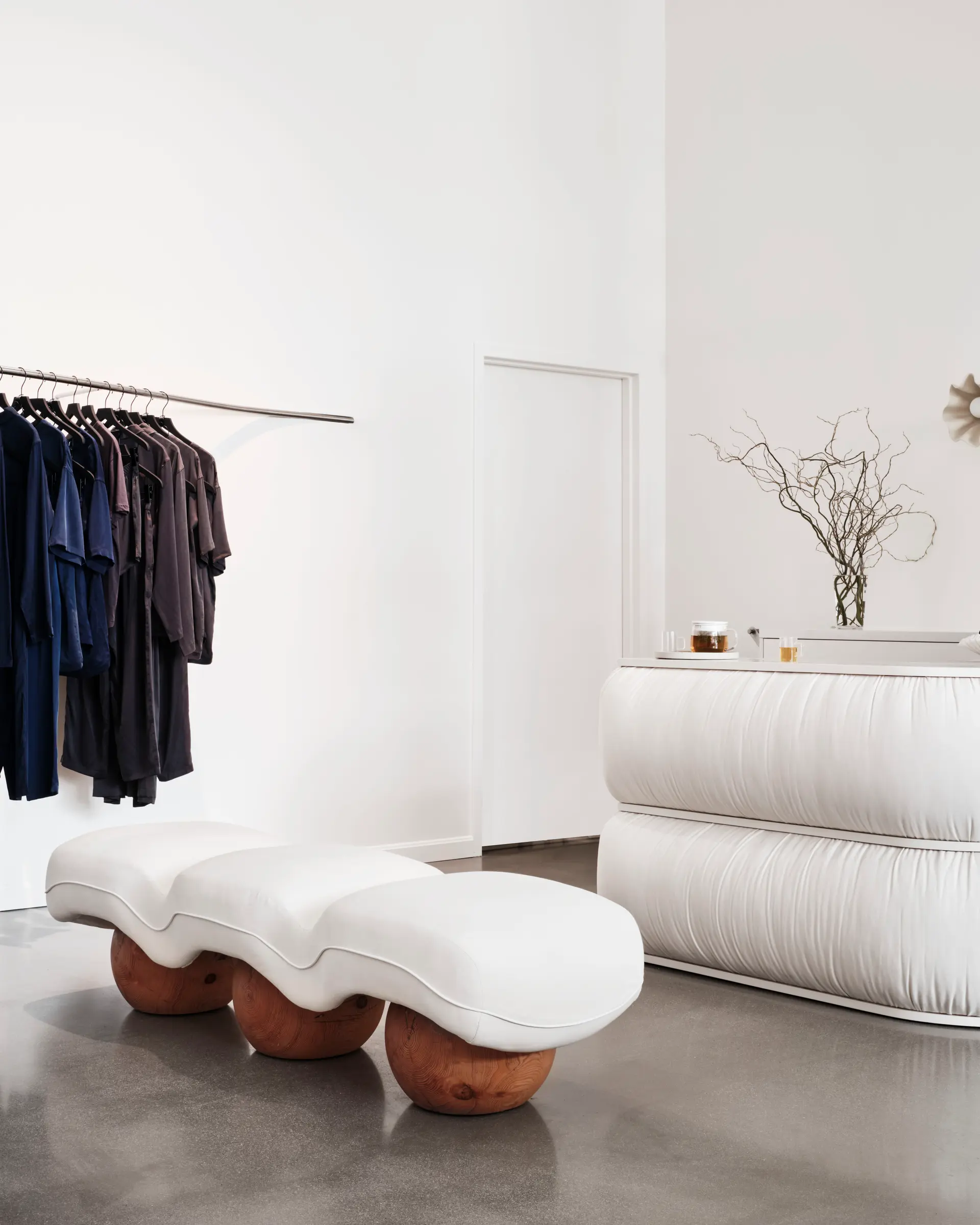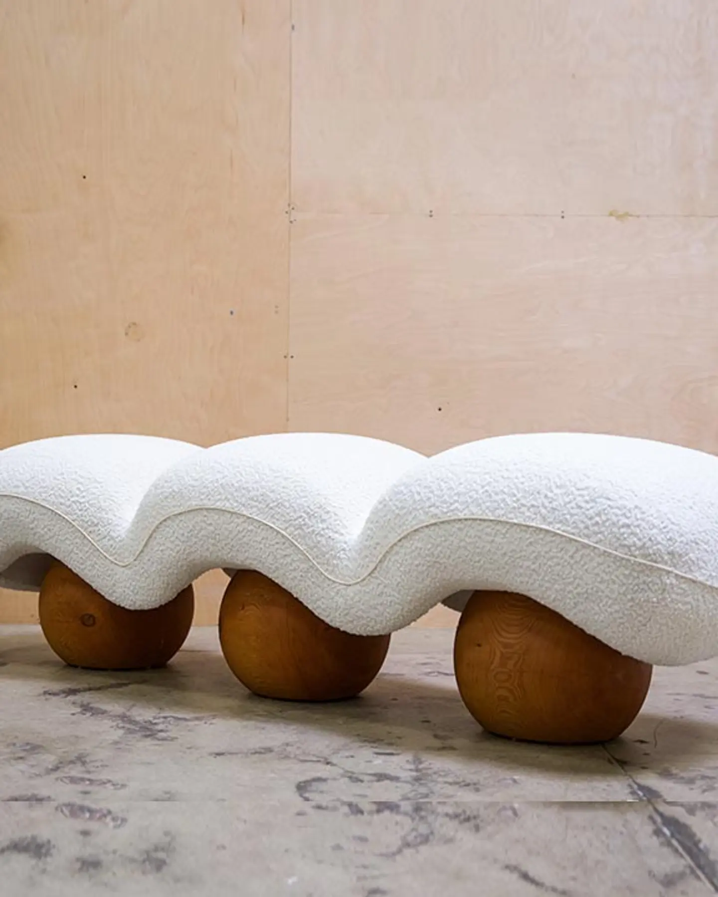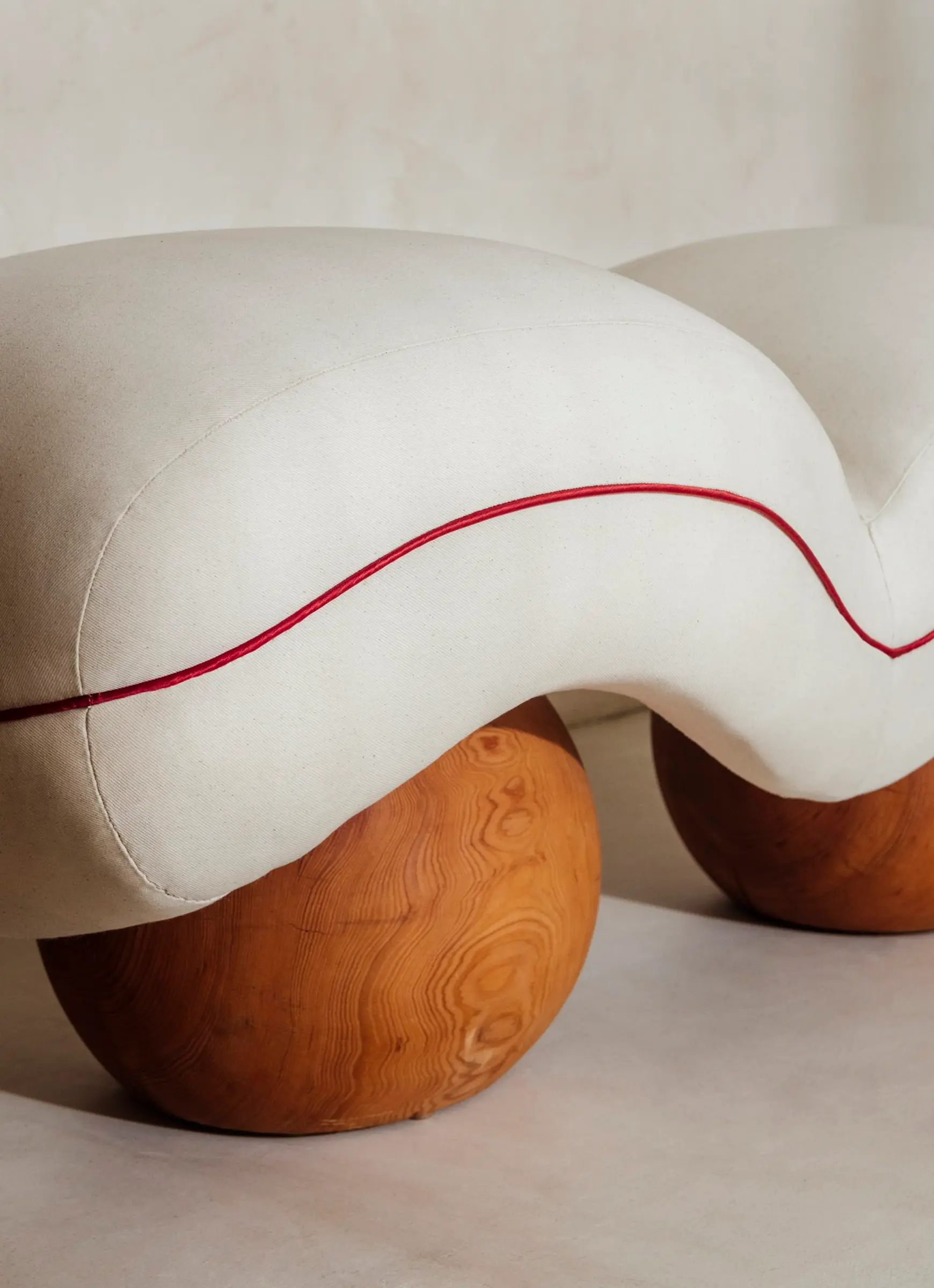 - Front view, pictured in a canvas fabric and natural salvaged Douglas fir wood finish