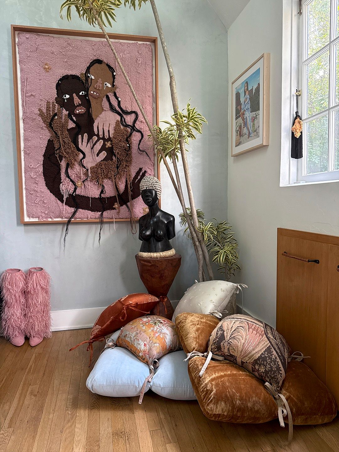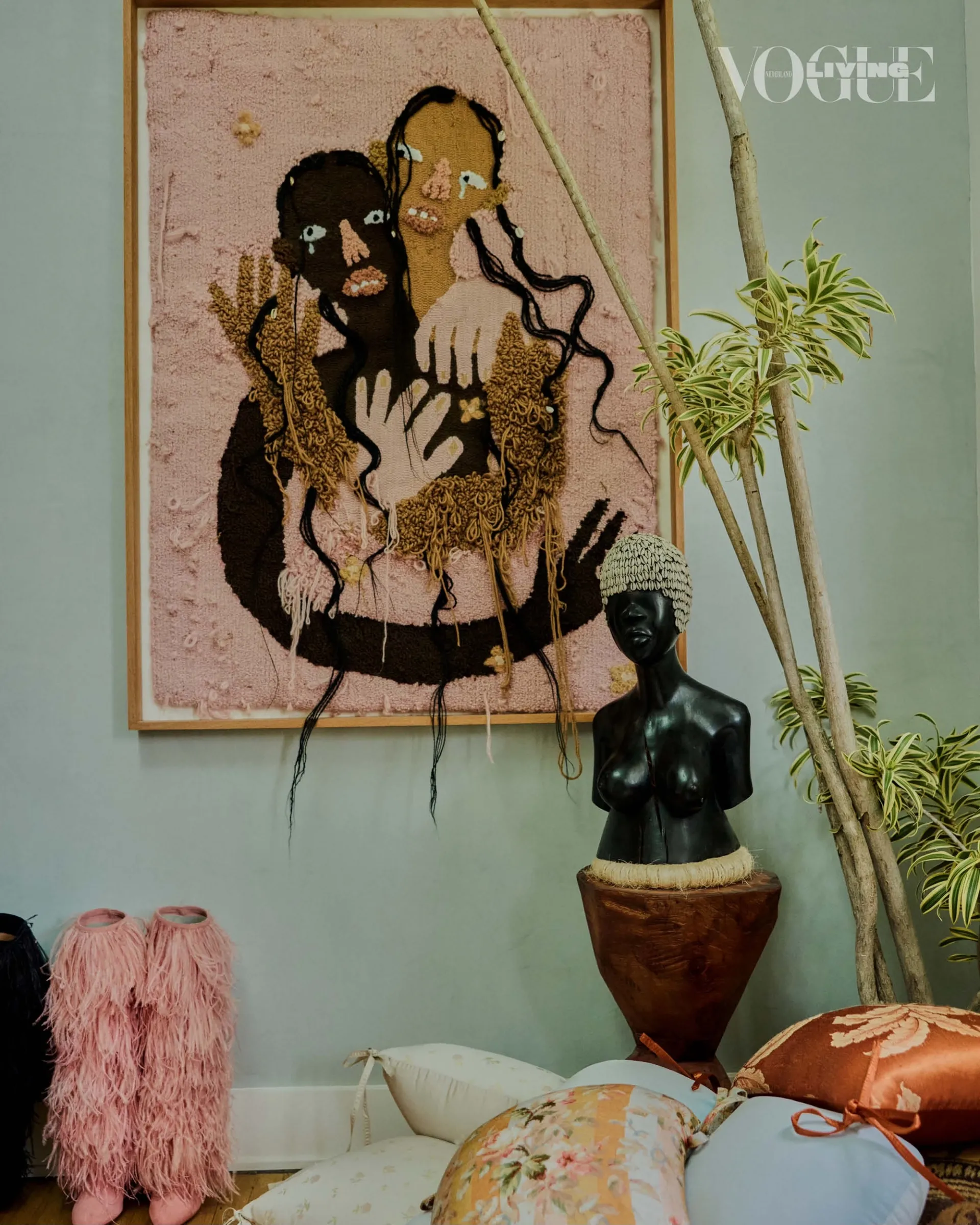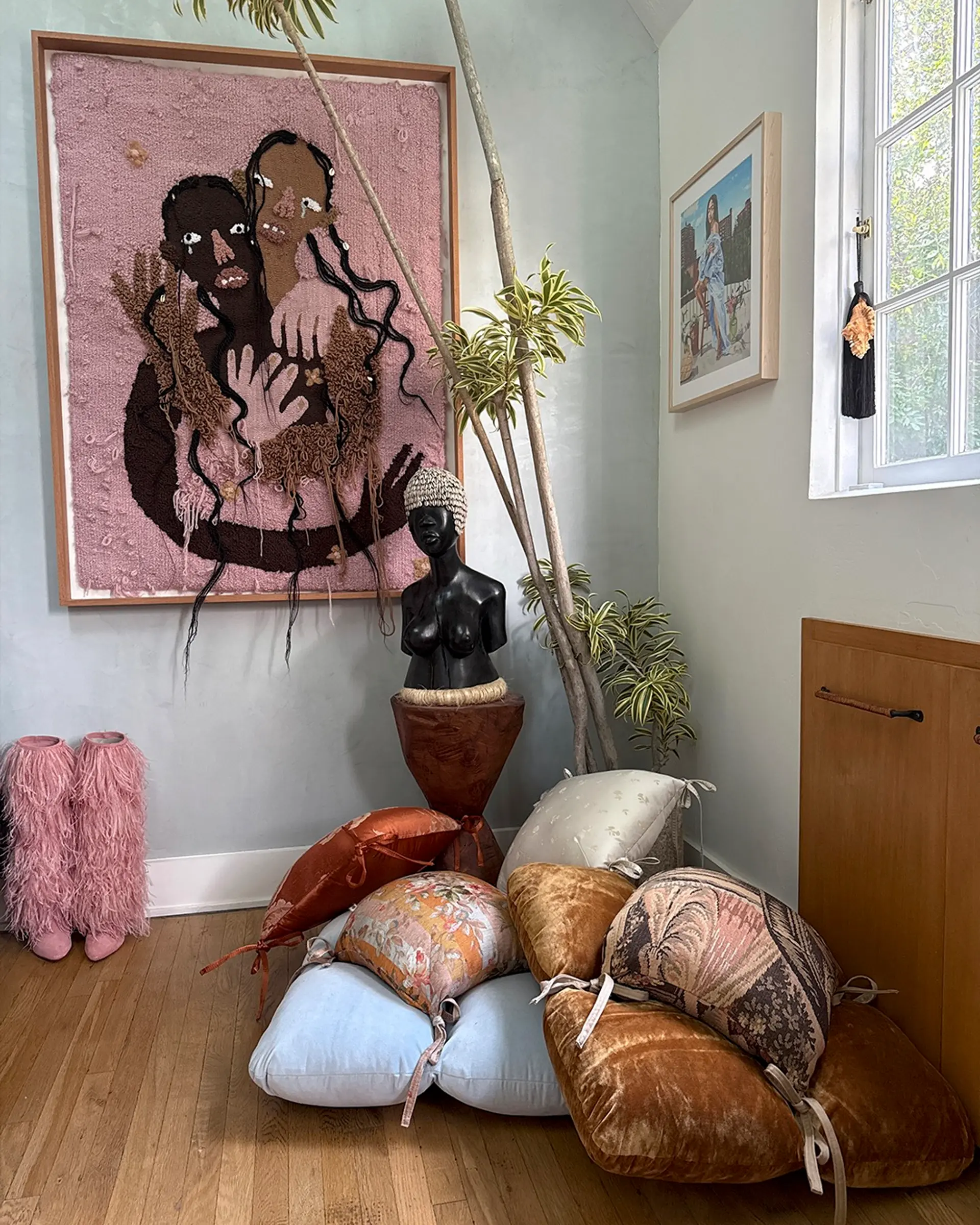 - Ivory bouclé base with floral tie pillow