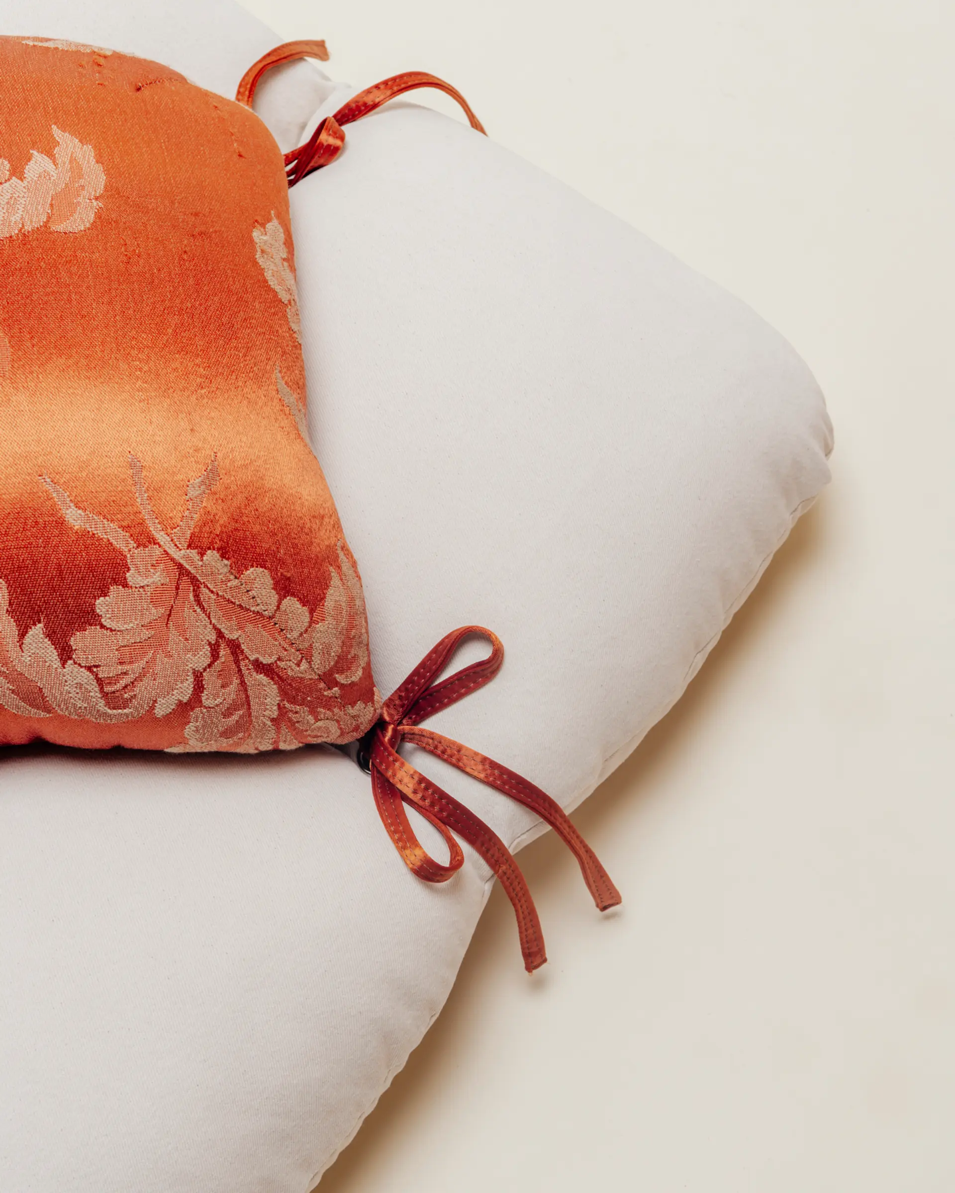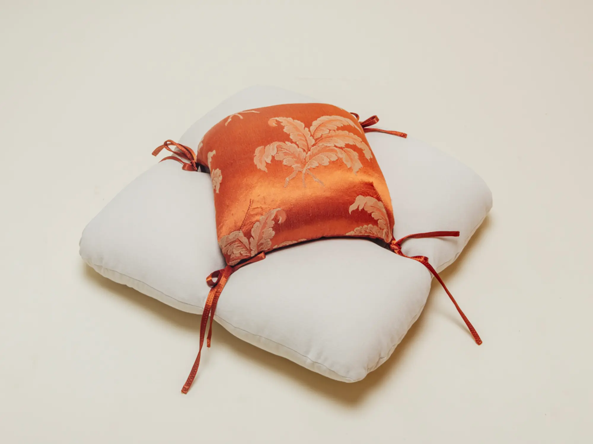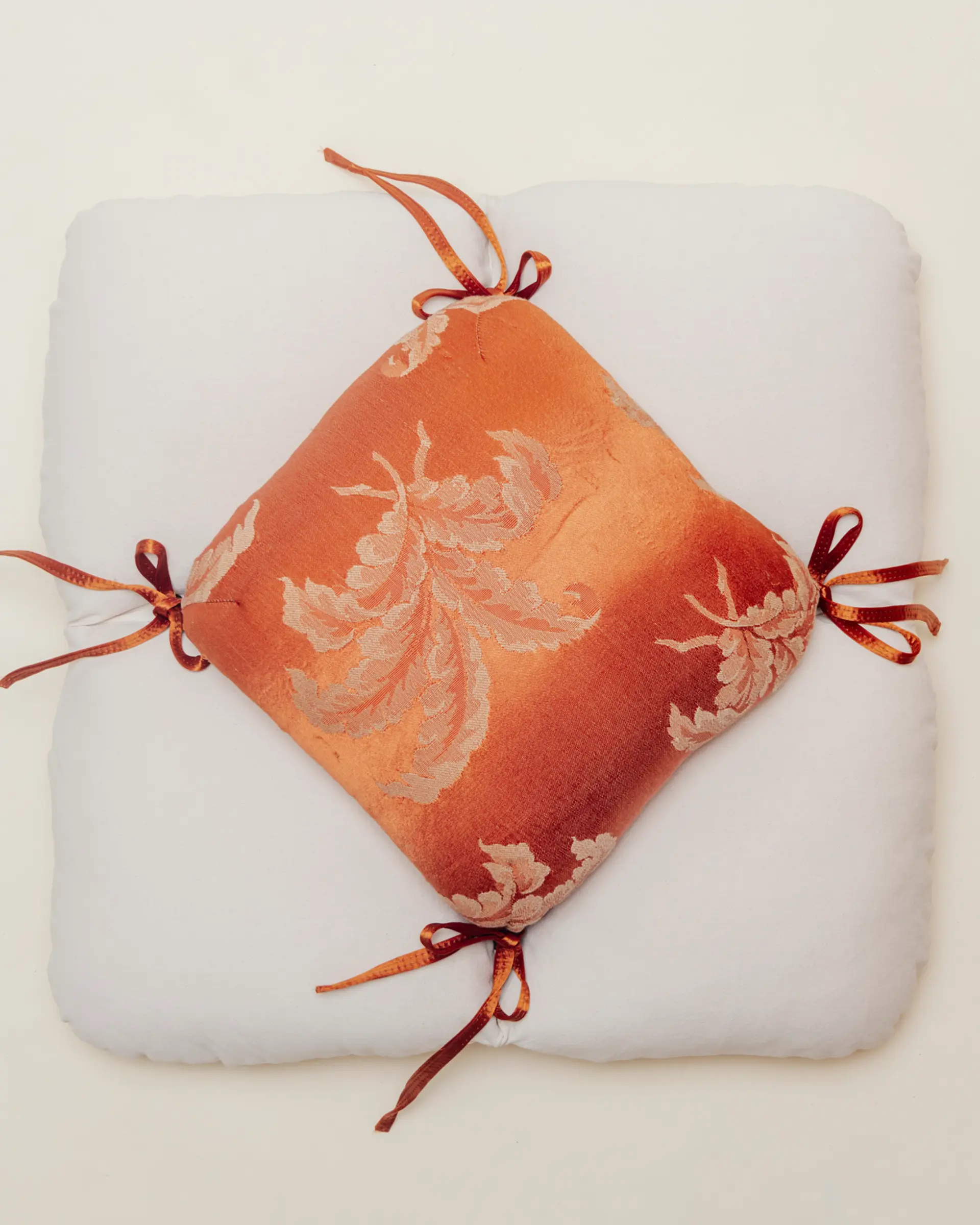 - Stack of Tie Pillows in ditsy floral satin, vintage satin and ivory boucle